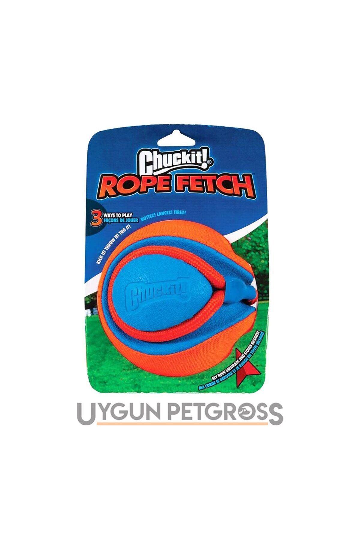 Chuckit! Rope Fetch'i ister atın, ister ipinden tutarak fırlatın, ister futboldaki hünerlerinizi göstererek şut çekin. En sert oyunculara dayanabilmesi için kalın Oxford kumaş ve kauçuktan üretilmiş olan Rope Fetch'i ister bir at getir topu, ister çekiştirme, ister tek köpeğinizin başına oynaması için kullanabilirsiniz. Üzerindeki çıkıntılar köpeğinizin topu rahatça kavramasına yardımcı olur. 14cm çapında olan Rope Fetch (halatı açıkken 57cm), 180gr ağırlığındadır.