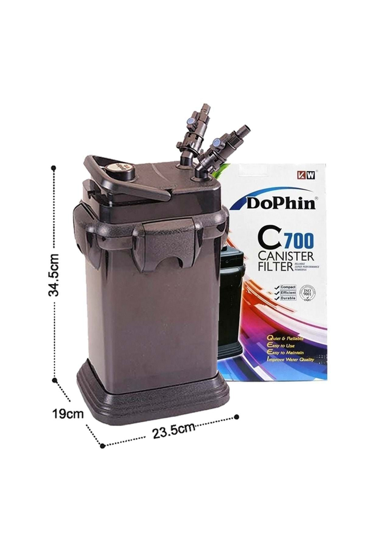 DOPHİN C700 DIŞ FİLTRE 100-250 Litrelik akvaryumlarda mekanik temizlik ve oksijen sağlar Saatte 1520 L/H filtrasyon yapabilen dış filtredir. Kullanım sırasındaki su çıkışı 650 litre/saat Filtre içerisinde bulunan 2 (iki) sepet içerisinde aktif karbon ve siyah sünger standart olarak bulunmaktadır. Eşsiz, son teknolojilerden esinlenerek üretilmiş tasarım. Tüm filtre hacminin etkili bir biçimde kullanılmasını sağlar. DOPHIN kalitesi ile daha az enerji tüketimi, daha güvenli kullanım, daha uzun kullanım ömrü ve daha az ses. Yararlı bakterilerin çoğalmasını sağlayan farklı filtre materyalleri. Pompa kafasının yapısı daha kolay temizlenmesini ve bakım uygulanmasını sağlar. Üstten pompası sayesinde ilk kurulumda kovaya suyun kolay gelmesi sağlanarak filtrenin hava yapmasını önleme avantajı mevcuttur.