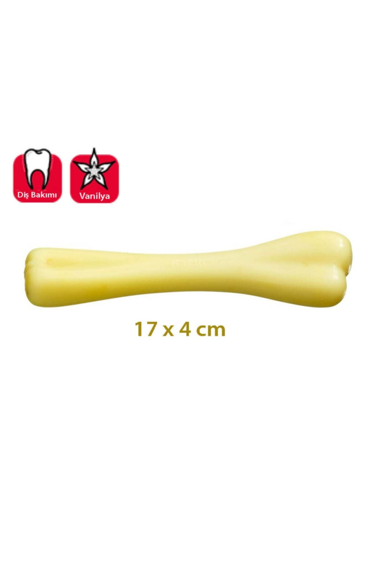Köpeğinizin severek oynayacağı Vanilya aromalı kemik. Kemik sert bir yapıya sahip olduğu için dişlerin güçlenmesini sağlar. Özellikle diş çıkartma döneminde yavru köpekler için idealdir. Köpeklerin kemirme sırasında diş ve diş eti bakımına yardımcı olur.