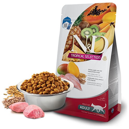 Tavuk, kılçıksız buğday, yulaf ve tropikal meyveli yetişkin kediler için formüle edilmiş tam mamadır.