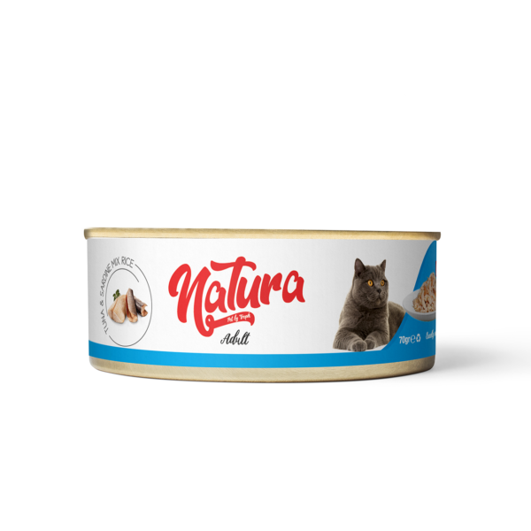Yetişkin kediler için özel olarak üretilmiş olan Natura, ton balığı, pirinç ve sardalya katkılı formülüyle %100 doğal bileşenlerden imal edilir.